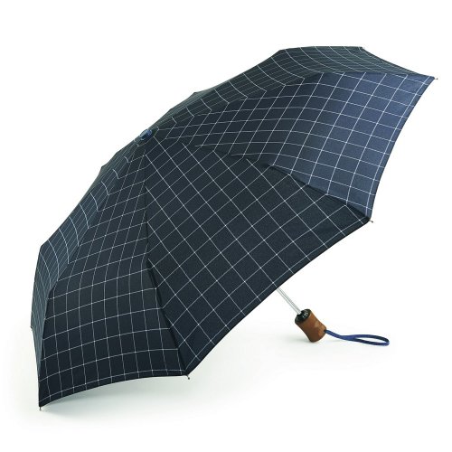 From Fulton, this navy compact umbrella has a grey checked pattern with a tan wooden handle and an auto open and close button function, to help withstand inversion in normal wind conditions.